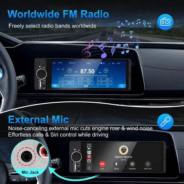 Upgrade your driving experience with this advanced Single Din Car Stereo, seamlessly integrating your digital life with your vehicle. The centerpiece is a vibrant 6.36 -inch HD touchscreen that brings Wireless Apple CarPlay and Android Auto to your fingertips. After a simple one-time setup, your smartphone automatically connects via Bluetooth upon every car start, giving you instant wireless access to navigation, music, calls, and messages for a safer, more connected journey. Take full command with your voice using Siri or Google Assistant, made crystal clear by the included external microphone that effectively minimizes background noise for impeccable call quality and reliable commands.