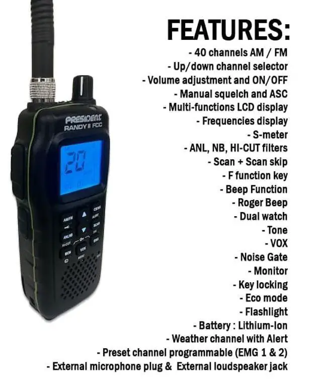 With a long-lasting battery pack, desktop dock, vehicle charger, and built-in flashlight, the Randy III is ready for any use. Whether you are navigating remote trails or coordinating logistics, this radio keeps you in control. Upgrade your communication with a CB radio trusted by professionals President Randy III.