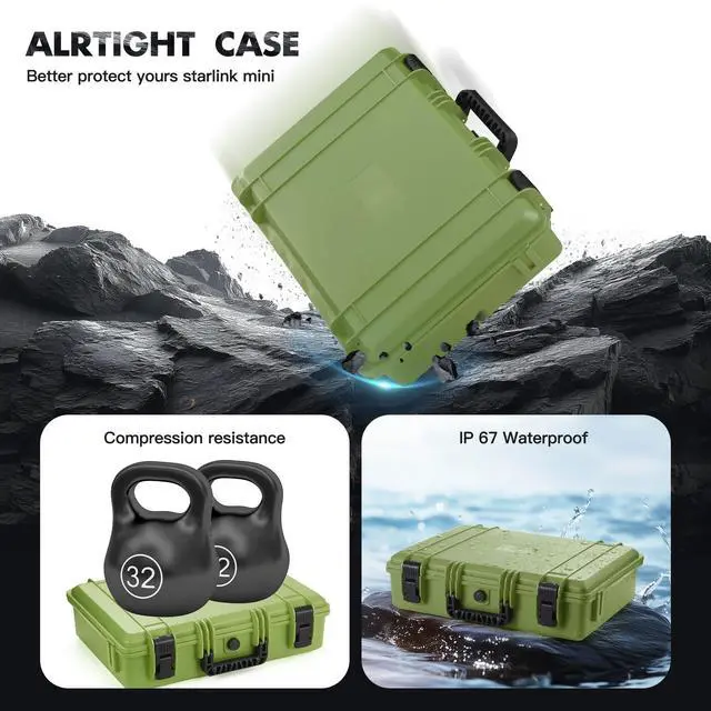 Custom Fit for Starlink Mini KitHard Case for Starlink Mini Dish, Durable Foam Case Fits For Starlink Mini Dish Kit, Kickstand, Pipe Adapter, Cables, Accessories. ^^ IP67 Waterproof ProtectionEngineered with a high-quality seal, starlink mini travel case is waterproof up to IP67 standards, dustproof, and impact-resistant. Its built to withstand tough conditions, whether for travel, storage, or outdoor adventures. ^^ Protective Foam InteriorFeatures thick, precisely-cut foam compartments designed to securely cradle your Starlink Mini dish and accessories. It is also water and oil resistant and will not absorb stains, ensuring a tidy and organized interior.