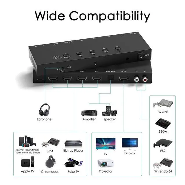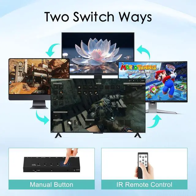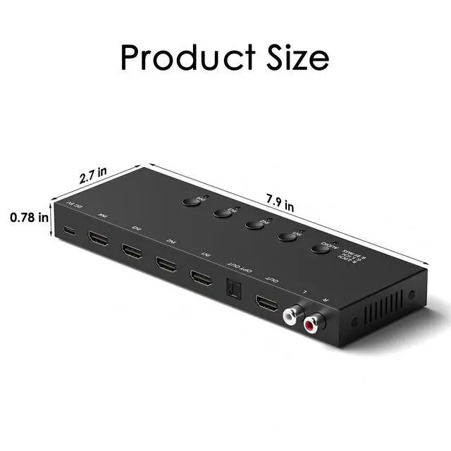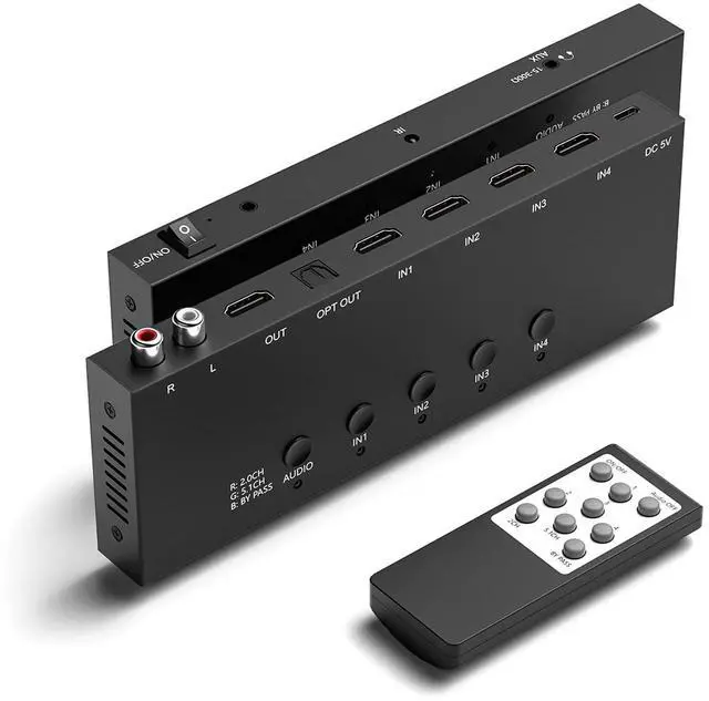 Audio Output): HDMI switch box equipped with audio extractor and ARC function. Connect up to 4 devices to TV or monitor and easily switch. At the same time, it supports HDMI ( 7.1 -channel audio)/optical fiber/left and right channel interfaces, which is easy to connect to surround sound systems or audio equipment to achieve customized audio configuration and immersive sound experience. ^^ Supports 2 Switching Methods IR Remote Control Switching; Panel Switch Button; you can press the switching button on the box to select the exact input you want. You can also control the AV/HDMI switcher via IR remote control to switch between AV/HDMI sources.