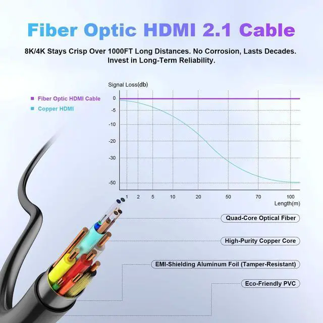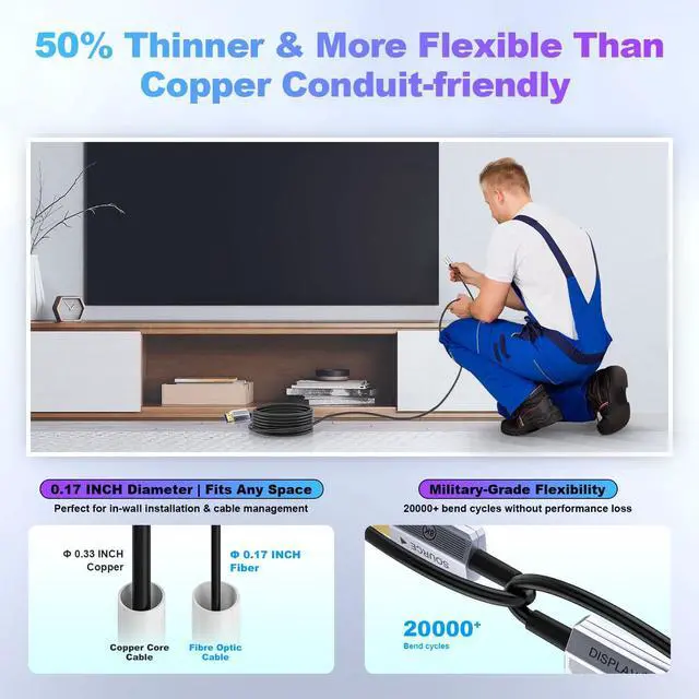8K/4K Ultra HD Over Long Distances50 ft hdmi cable delivers flawless 4K@120Hz, 8K@60Hz, and HDR signals up to 1000ft+ without signal degradationunlike copper cables that lose quality beyond 15ft. ^^ HDMI 2.1 ^^ 48Gbps Bandwidthhdmi fiber optic cable supports 8K@60Hz, 4K@120Hz, VRR, ALLM, and eARC for next-gen gaming (PS5/Xbox Series X) and home theater setups. Fully future-proof for 8K TVs and GPU ^^ Zero Interference ^^ Perfect for Complex SetupsFiber optic technology of our active hdmi cable eliminates EMI/RFI noise from power cables, speakers, or Wi-Fi routersideal for professional AV racks and crowded wiring ^^ Ultra-Thin & Flexible Design Fiber optic hdmi cable 50ft is 50% thinner and lighter than copper cables, with 360 bendability for easy in-wall conduit routing or tight spaces behind TVs ^^ Durable & Low MaintenanceNo copper oxidationlasts for decades.