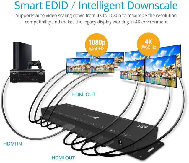 4K @60Hz (YUV 4:2: 0 10-bit), 3D, xvYCC, x. v. Color & Deep Color. Supports 7.1 / 5.1 Ch, Dolby Digital, DTS-HD and Dolby TrueHD audio. Works with PS4, Roku, Apple TV, Nvidia Shield, Fire TV, Blu-Ray Players. ^^ AUTO VIDEO SCALING/DOWNSCALING Supports mixed 4K & 1080p display outputs. A 4K video source device can simultaneously display 4K content to 4K monitor (s) and 1080p content to 1080p monitor (s) via downscaling. * See important notes in the description ^^ CASCADABLE Easy and stable to cascade multiple splitters for more outputs. Comprehensive EDID options and Firmware upgradeable ^^ MADE IN TAIWAN & LOW HEAT GENERATION Sturdy metal enclosure provides durability and minimizes EMI/RFI noise interference. Low heat generation and ESD protection to guarantee the highest stability. FCC, CE & RoHS compliant. Made in Taiwan. Our products are backed and experienced tech support team in Silicon Valley. If you have any questions or concerns, visit our gofanco website or click on our name in the buy box and select "Ask a Question".