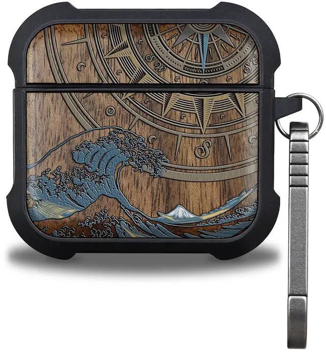 Patterit for AirPods 4 Case (2024) (USB-C), Shockproof Cover with Quick Released Keychain, Compatible with AirPods 4th Generation, Natural Wood Hand-Drawn (Compass and Wave) Walnut