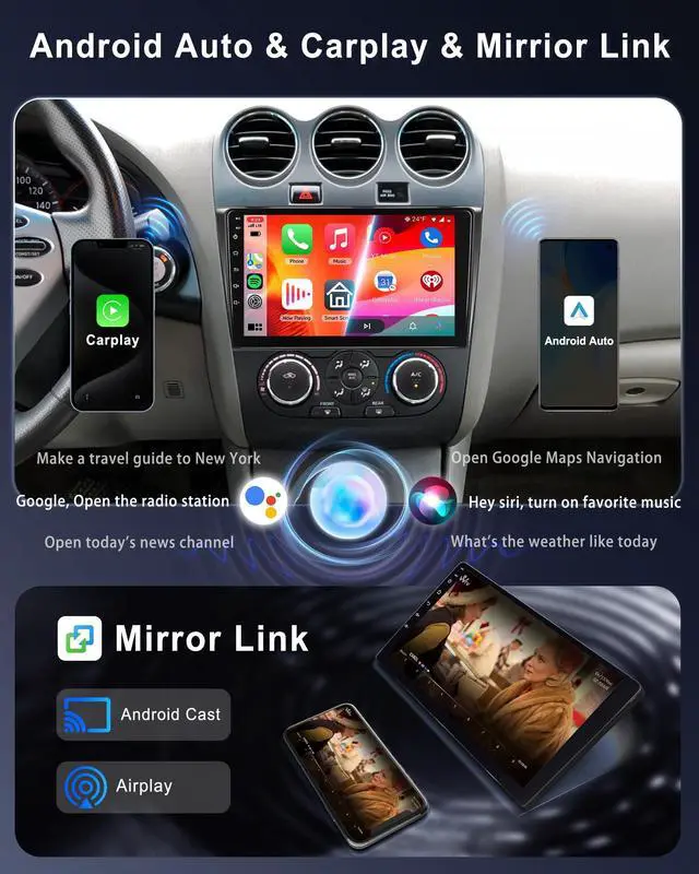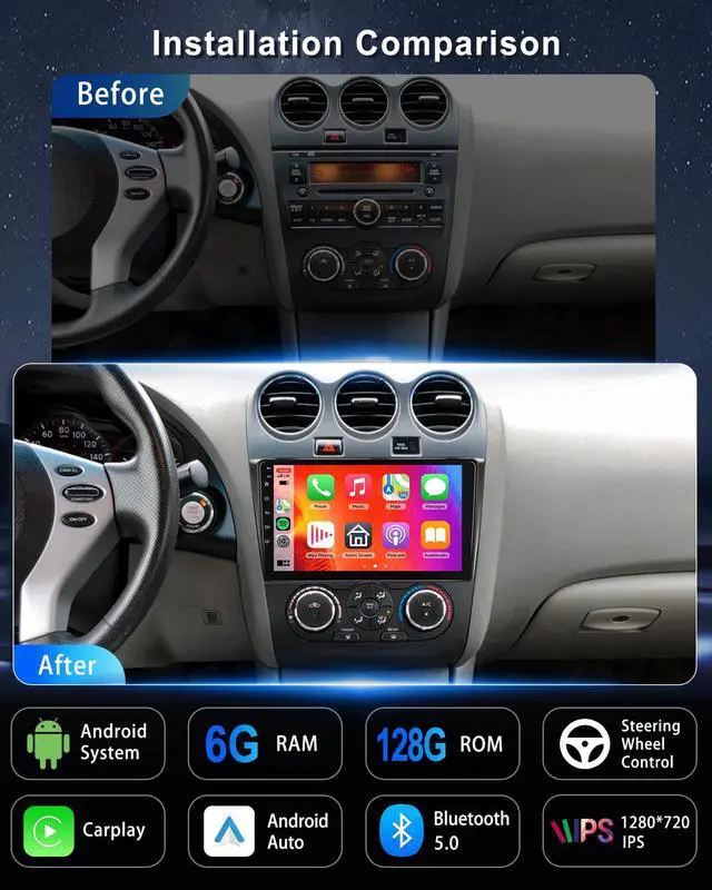 Plug-and-Play Installation: Engineered exclusively for 2008-2012 Nissan Altima (Manual A/C), this car stereo features an 8-core CPU, 6GB RAM, and 128GB storage. It ensures lightning-fast app launches, lag-free multitasking, and massive space for maps, music, and apps. The plug-and-play harness enables a seamless, no-hassle installation without extra modifications, perfectly matching your original cars interior ^^ Wireless CarPlay/Android Auto +