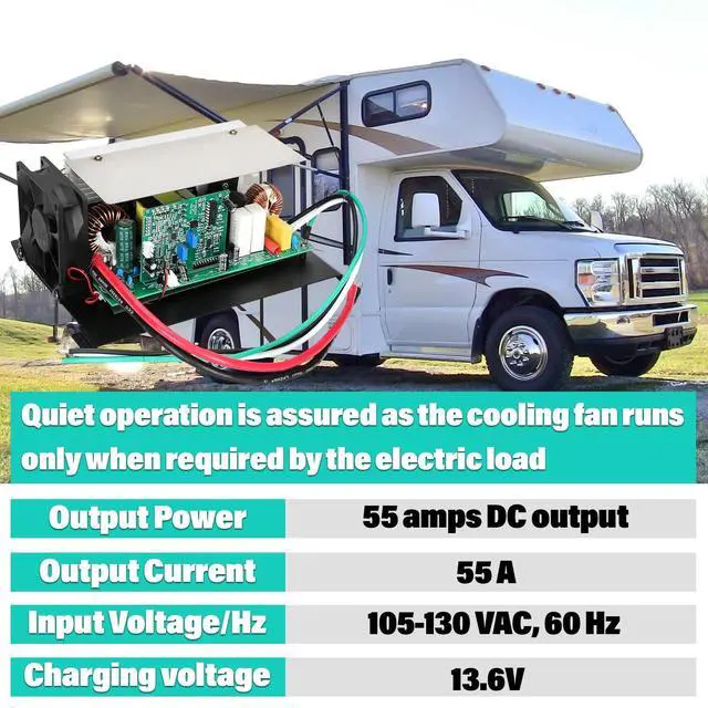 AInput Voltage/Hz: 105-130 VAC, 60 HzQuiet operation is assured as the cooling fan runs only when required by the electric load ^^ After-sales serviceWe not just sell them, we also provide professional after-sales service, so welcome to discuss with us, we will try to do technical support as much as we can ^^ Easy to InstallThe RV power converter is very easy to install with just a few screws, three AC wires, and two DC wires, Installation takes only ten minutes ^^ NOTESAC wiring the White labeled Live and the Black labeled Neutral. green is ground