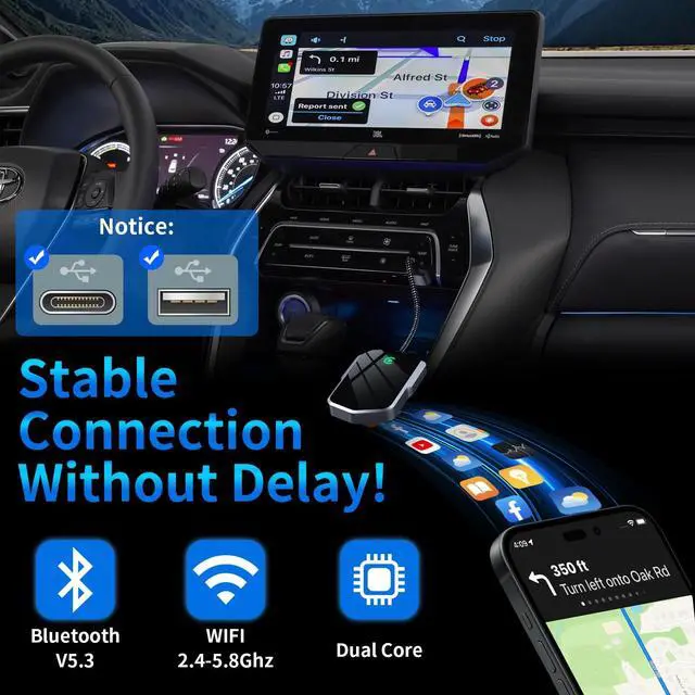 Excellent A7 car-grade smart chip: helps you focus on driving. Wireless carplay is equipped with 5.8 GHZ WiFi, 5.3 Bluetooth and an 8-core processor, which increases the transmission speed by 40% while ensuring a stable connection and no delay.