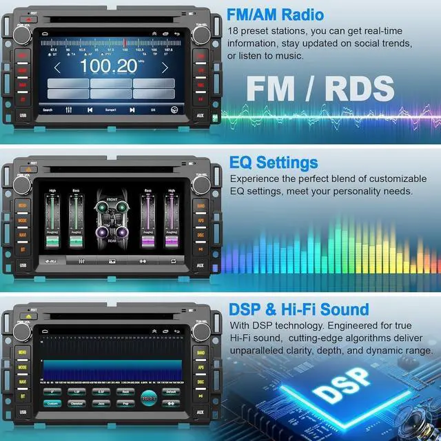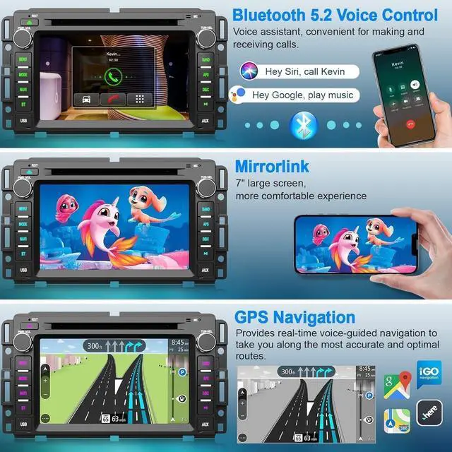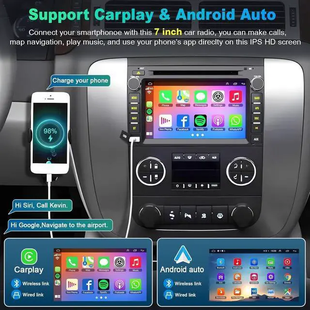 Applicable Car ModelsCar stereo for Chevy Silverado 1500HD 2500HD 3500HD (2007-2014) (Second Generation); For Chevy Avalanche (2007-2011); For Chevy Express Van (2008-2011); For Chevy Impala(2006-2012); For Chevy Tahoe (2007-2014); For Chevy Equinox (2005-2009) (First Generation); For Chevy Suburban (2007-2014); For GMC Acadia (2007-2012); For GMC Savana (2008-2013); For GMC Sierra (2007-2011); For GMC Yukon (2007-2013); For Buick Enclave (2008-2012) ^^ DVD PlayerThis car audio supports DVD playback, so you can play any disc and make your journey less boring. ^^ Wired/Wireless CarPlay & Android Autocar stereo for GMC/Chevrolet/BUICK support wired/wireless Apple CarPlay and Android Auto, With wired connection or wireless connection through Bluetooth, you could more easily access the apps of your phone.