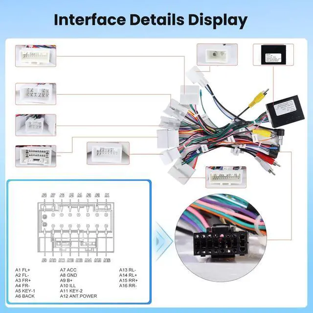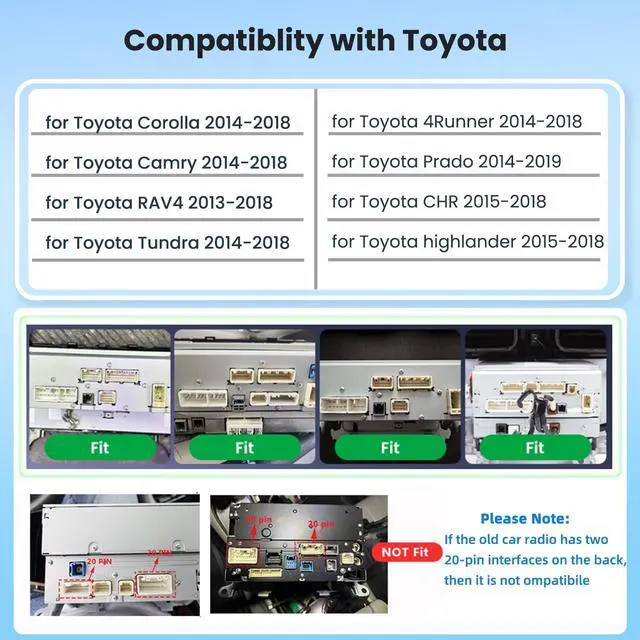 for Toyota J-B-L 16 Pin HarnessThe radio wire harness adapter support JBL amplifier for Toyota Corolla (2014-2018), for Toyota Camry (2014-2018), for Toyota RAV4 (2013-2018), for Toyota 4Runner (2014-2018), for Toyota Prado (2014-2019), for Toyota Tundra (2014-2018), for Toyota Highlander (2015-2018), and for Toyota C-HR (2015-2018) ^^ Plug-and-play integrated wiring harnessSuitable for most Toyota vehicles equipped with a JBL amplifier and factory rear camera, support steering wheel control ^^ MAHVEC RecommendPlease provide the following information before purchasing: Your vehicle's model year Photos of the dashboard and the back of the original car radio. Our technical team will verify compatibility to ensure you receive the correct wiring harness. ^^ Please enter the MAHVEC store and search for the keyword "Toyota" to make a purchase related car stereo