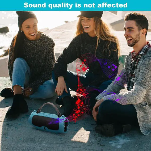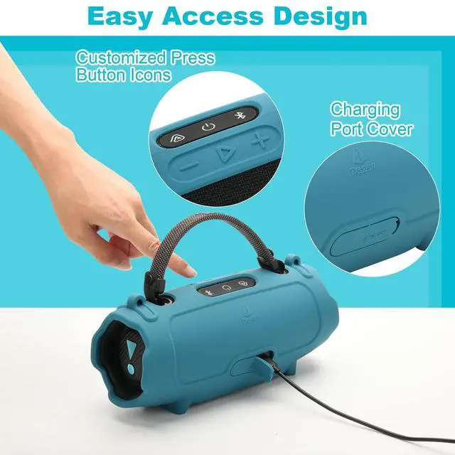 This silicone case provides full protection for the speaker, including the back, with thickened design at both ends, provide full protection from scratches and drops. ^^ Easy Access DesignThis Charge 6 carrying case is designed for easy access to all buttons, make it convenient to control the buttons. Special designed anti-dust cover for USB-C port, keep the port from dusts, easy to charge the speaker without removing the case. Sound quality is not affected with the case on. ^^ Portable Travel Carrying CaseThe silicone case for JBL Charge 6 is equipped with an adjustable shoulder strap and two carabiners, convenient carry the speaker when travel.