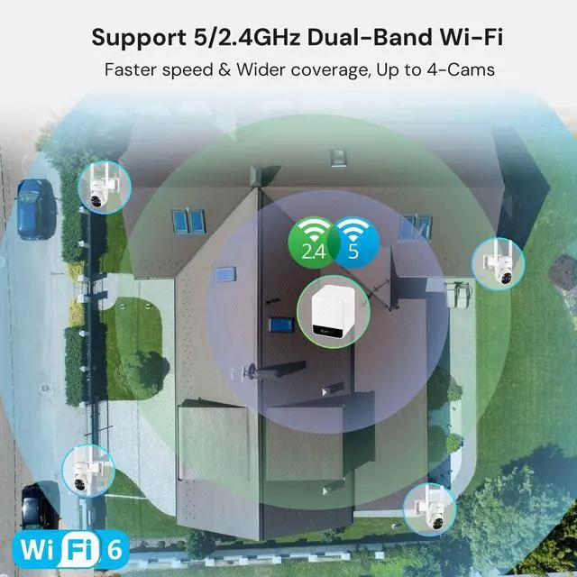 & Dual-Band Technology: Homebase supports Ethernet or Wi-Fi connection. Newly upgraded Wi-Fi 6 and 2.4 Ghz & 5 Ghz dual-band make the base station a stable Wi-Fi extender. Compared with regular Wi-Fi connected cameras, the wireless security camera system extends coverage via 2.4GH z, increases transmission rate and stability via 5GHz, even if the solar outdoor wireless cameras are located on the roof, yard, or garage ^^