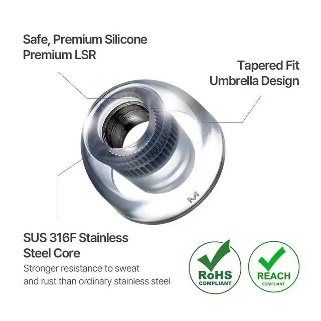 1. Engineered for HiFi IEMs Designed for in ear monitor headphones, wired ear buds, and IEM earphones, delivering clarity and precision for audiophiles. ^^ 2. Surgical Stainless Steel Core Preserves vibrations from your IEM earbuds without distortion, preventing muffled or flattened sound and unlocking a true soundstage. ^^ 3. Certified Premium Silicone Comfort Made from hypoallergenic silicone tested to EU RoHS, and EU REACH standards, ensuring a safe, skin-friendly fit for long listening sessions with IEM headphones. ^^ 4. Replacement Earbud Tips Works as earbud replacement tips or ear bud rubber tips, offering solid bass and clear highs for your best IEM earbuds.