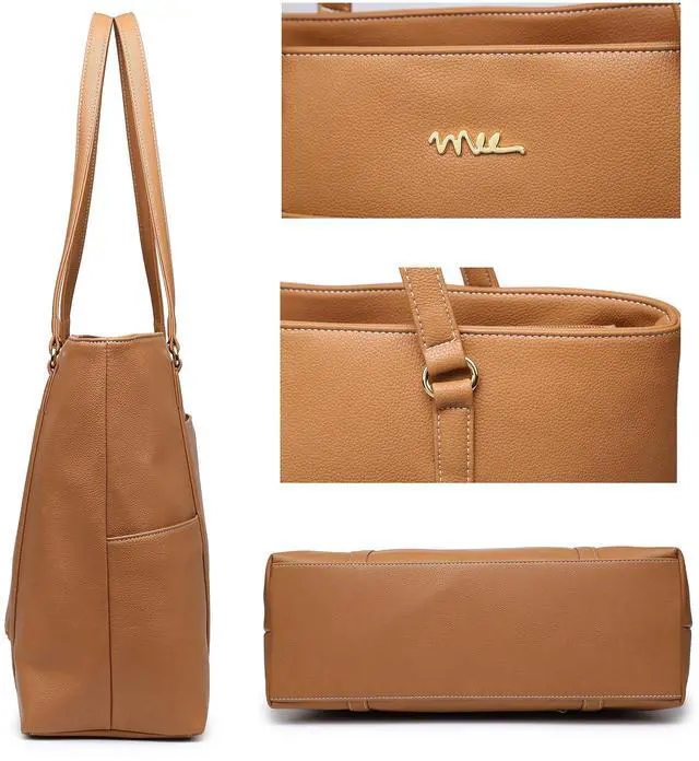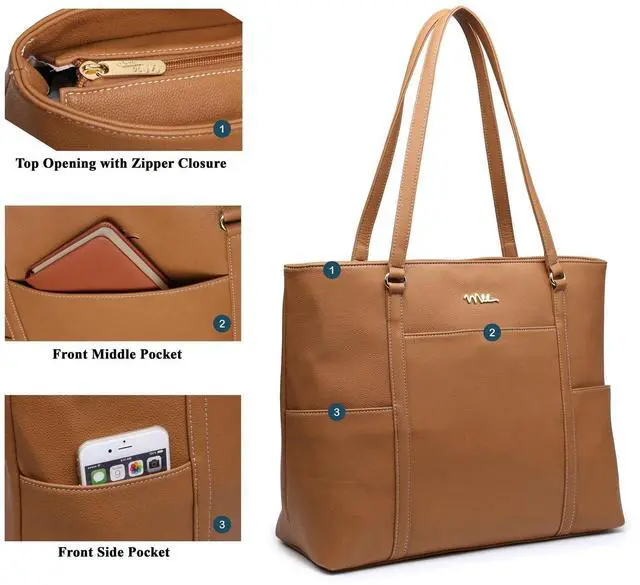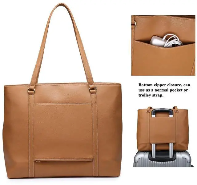 Constructed with High Quality Faux Leather Strong Durable and Water Repellent Material ^^ Easy Handling with Strong Soft 11.5 inch Shoulder Drop with Quality Gold Tone Hardware ^^ Thick Padded Laptop Compartment & Organization Panels for Phone, Wallet, Pens, Accessories and more ^^ Fully Lined Soft Interior and Many Exterior Pockets Provides Easy Access. Rear zippered pocket can be use as trolley strap. ^^ Compatible with MacBook Laptop Notebook Ultrabook Size Up To 15 15.6 Inch