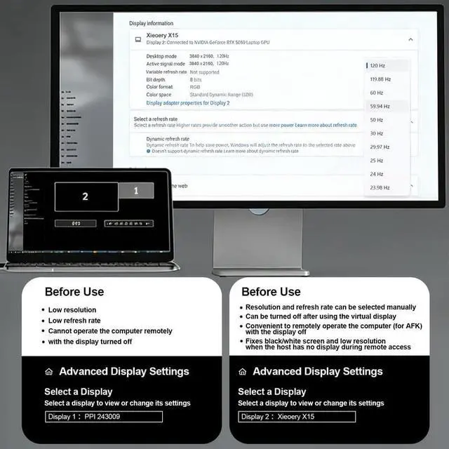(Actual output depends on GPU, cable and system support. ) ^^ Designed for Headless GPUs & High-End Workflows Keeps GPUs fully active by emulating a real 4K displayideal for GPU servers, rendering nodes, KVM systems, game streaming, VR pipelines and remote desktop environments. ^^ Wide Resolution & Refresh Rate Compatibility Supports a broad resolution set from 38402160 down to 800600, with multiple refresh rates up to 120Hz, ensuring compatibility with both modern and legacy systems.