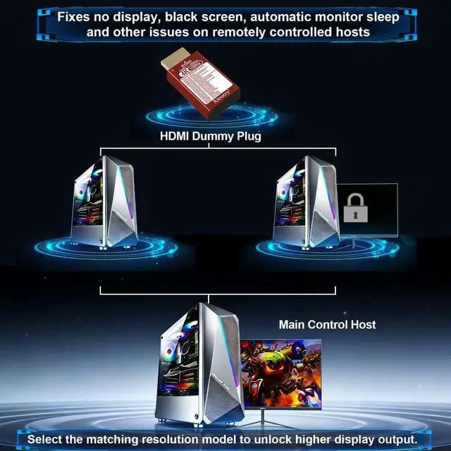 HDMI 2.1 EDID Emulator with 48Gbps Bandwidth Built on HDMI 2.1 EDID profiles, this dummy plug advertises up to 48Gbps link capability, enabling modern GPUs and consoles to unlock 4K @ 120Hz output modes that are not available with HDMI 2.0 adapters. ^^ Default 4K Resolution for Reliable System Startup Provides a default virtual display of 38402160 @ 60Hz, ensuring stable graphics initialization, preventing resolution fallback and eliminating black screens in headless or remote setups. ^^ Unlocks 4K @ 120Hz on Compatible Systems Supports 4K 120Hz EDID emulation, allowing compatible GPUs (RTX 30/40, RX 6000/7000) and consoles (PS5, Xbox Series X) to enable high-refresh 4K modes.