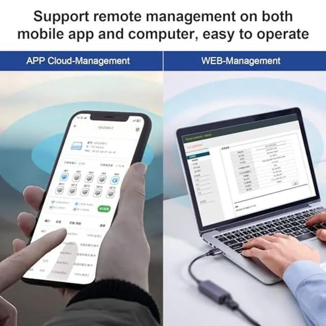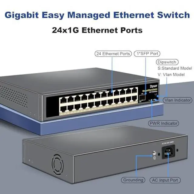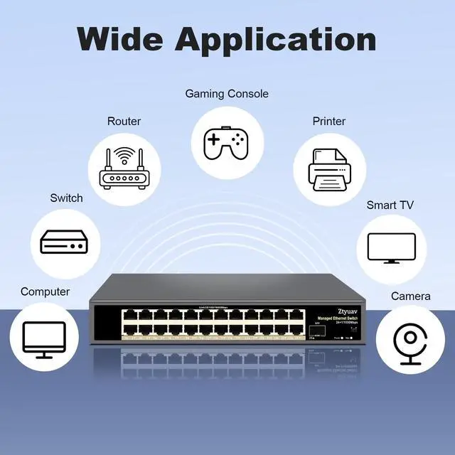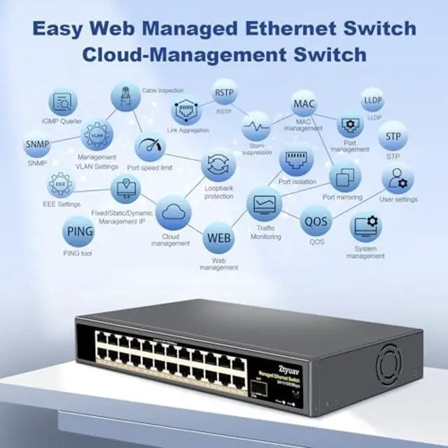 Cloud-Managed SwitchEquipped with 24 ethernet ports and 1 SFP+ Port 10/100/1000Mbps each, which can support bandwidth up to 50Gbps and maximum power up to 30W. Our Networking Switches Adopting 4M cache chip, durable metal casing, side heat dissipation holes and built-in cooling Fan design. ^^ APP & WEB ManagementMeet multiple management functions, such as Web/IP/Port/MAC/System/User Management, Link Aggregation, Port Isolation, Loopback Protection, Port Mirroring, Port Speed Limit, EEE/LLDP Protocol, SNMP, Spanning Tree, VLAN, QOS, Multicast, Storm Suppression, Traffic Monitoring, Cable Tester, Cloud-Network Link, Network Diagnosis and so on.