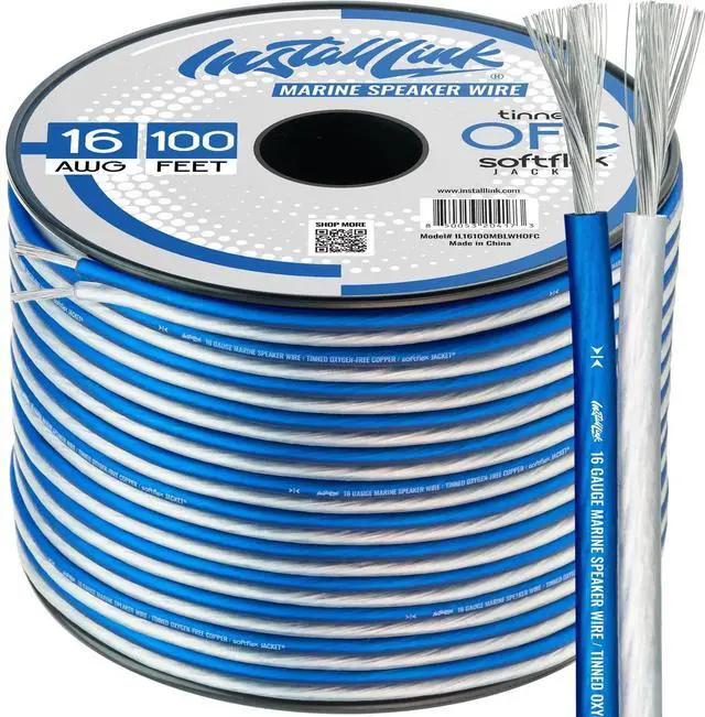 PREMIUM MARINE SPEAKER WIRE [ Frosted Blue/White ^^ 100-feet ( 30.5 m) ^^ 16 Gauge ] - Featuring a double conductor, this stranded wire is constructed from high-grade oxygen-free copper. It is perfect for achieving outstanding audio performance, exceptional flexibility, easy stripping and great polarity identification. ^^ TINNED OXYGEN-FREE COPPER (Tinned OFC) - This is a specialized type of speaker cable designed for use in harsh environments. Made of a pure copper core that is coated with a layer of tin, this cable offers excellent conductivity and low resistance, which result in high-quality sound.