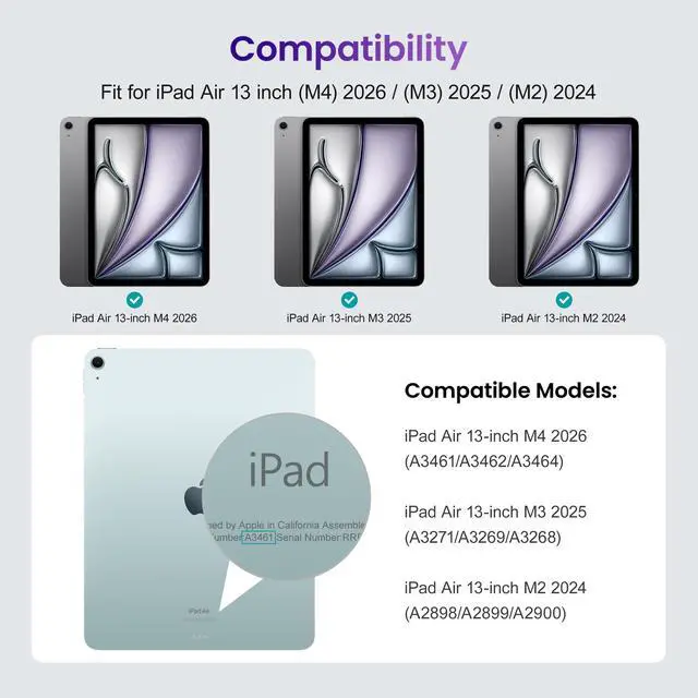 Compatibility Model: This Case is compatible with Apple 13-inch iPad Air M4/ (M3) / (M2) (2026/2025/2024 releasedModel: A3268/A3269/A3271/A2898/A2899/A2900, Not compatible with any other iPad devices. ^^ New Upgraded