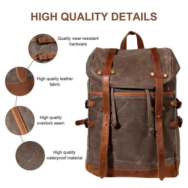 ^^ Premium Quality Material: This backpack is made of waterproof durable canvas and top quality genuine crazy horse leather trim. The premium quality ensure the long lasting durability. The high density canvas is made of pure cotton, its strong, hard-wearing, scratch-resistant. The crazy horse leather is made of high-end top layer cowhide material, with a thickness of 2.5 mm, which is solid and durable, and the quality solid hardware wont gather rust easily.