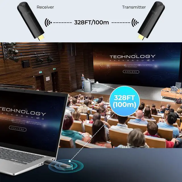Play: The wireless HDMI extension transmitter and receiver offer true plug-and-play functionality. Bluetooth HDMI connection devices can be easily set up in just a few seconds, eliminating the need for messy cables, WiFi, apps, Bluetooth, or settings. Zero-delay technology ensures zero latency, providing smoother operation, keeping your workspace tidy, and delivering seamless, high-quality streaming media playback. ^^ 5G & 2.4G Dual Band 328 Ft Wide