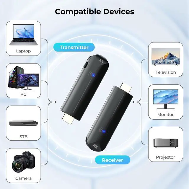 Wide Compatibility: The wireless HDMI connector supports 4K decoding and 60Hz 1080P full HD output, and the transmitter is compatible with all devices equipped with HDMI output ports, such as DVD players, personal computers, set-top boxes (STBs), and game consoles. The receiver is compatible with all devices equipped with HDMI input ports, such as televisions, projectors, and monitors. ^^ Copy and Extended Dual