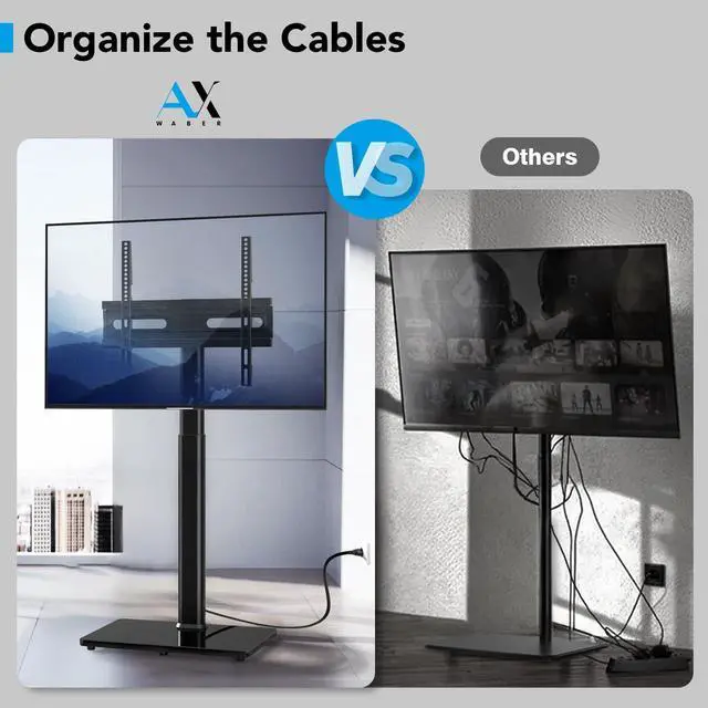 COMPATIBILITY AX WABER floor tv stand is universally designed to fit most 27-65 inch TVs, supporting up to 88 lbs with mounting holes from 100x100mm to 400x400mm. tall tv stand for bedroom, dorm room, or living room ^^ BUILT-IN POWER OUTLET This black tv stand features a convenient integrated power outlet on the back, 4 AC outlets(120V/15A). With a 6.5 ft power cord, provide easy access to power your TV, eliminating messy cords and power strips ^^ MULTIFUNCTIONAL FLOOR TV STAND My functional TV mount have 9 level height adjustment in order to choose your best space, besides -35 to +35 degree swivel mount can choose the best viewing to catch TV entertainment ^^ SMART DESIGN This smart floor TV stand comes with solid tempered glass base that connects to a solid steel pillar which provides stable support for your TV that creates a modern look for your audio video equipment, it can hold up to 88lbs ^^ HEAVY DUTY TV STAND WITH EASY ASSEMBLY Comes with related hardware parts and a detailed installation manual, besides every parts we have marked the related number based on it, customer can know the parts list clearly, this floor stand can be installed within 15 minutes, besided cable management can make your environment tidy