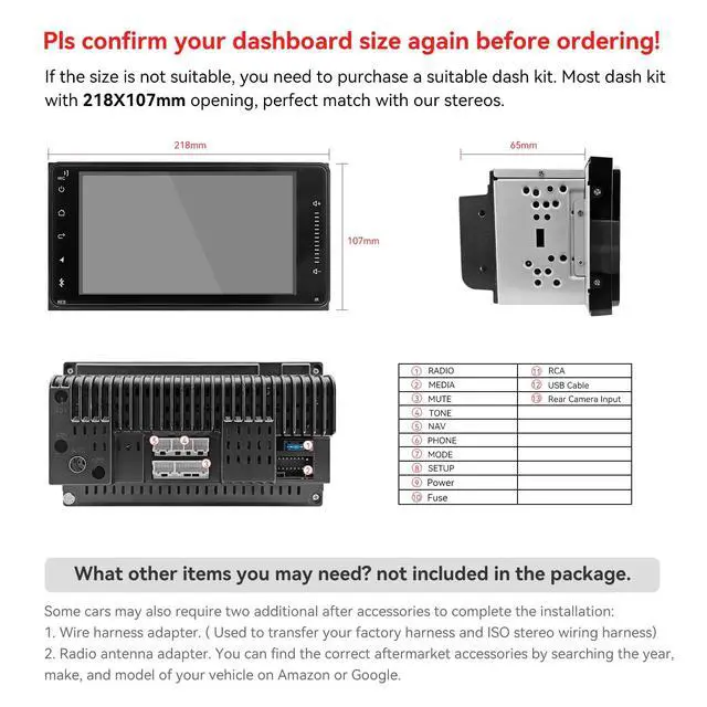 Hassle-Free Setup: Ensure compatibility by checking your car's dashboard opening size, factory wiring harness, and radio antenna adapter before purchase. With a machine installation size of 218mm x 107mm, and an included adjustment frame, setting up your new multimedia player is a straightforward process!