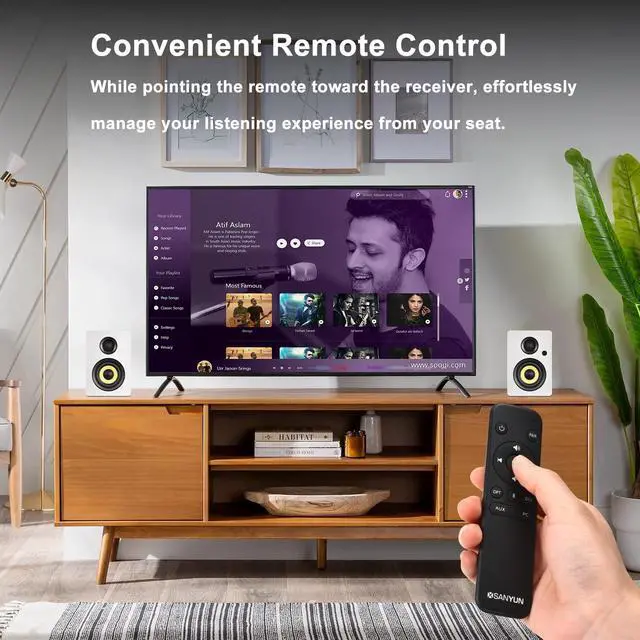 ^^ Versatile Audio Hub: Connect & Play All Your SourcesUnify your audio world! Effortlessly connect TVs, turntables (with preamp), PCs, laptops, phones, and more via a comprehensive range of inputs: Optical, Coaxial, TRS, 3.5 mm AUX, Bluetooth 5.4, and USB. The integrated USB port features a built-in 24-bit DAC, delivering enhanced sound quality from your computer. Enjoy the unique flexibility of playing audio from multiple connected sources simultaneously! ^^ Convenient Remote ControlManage your listening experience effortlessly from your seat. The included infrared remote lets you: adjust volume, toggle between audio inputs, power the unit on/off (standby mode). This combination of versatile connectivity and easy remote control makes SW206 the perfect centerpiece for your daily audio life.