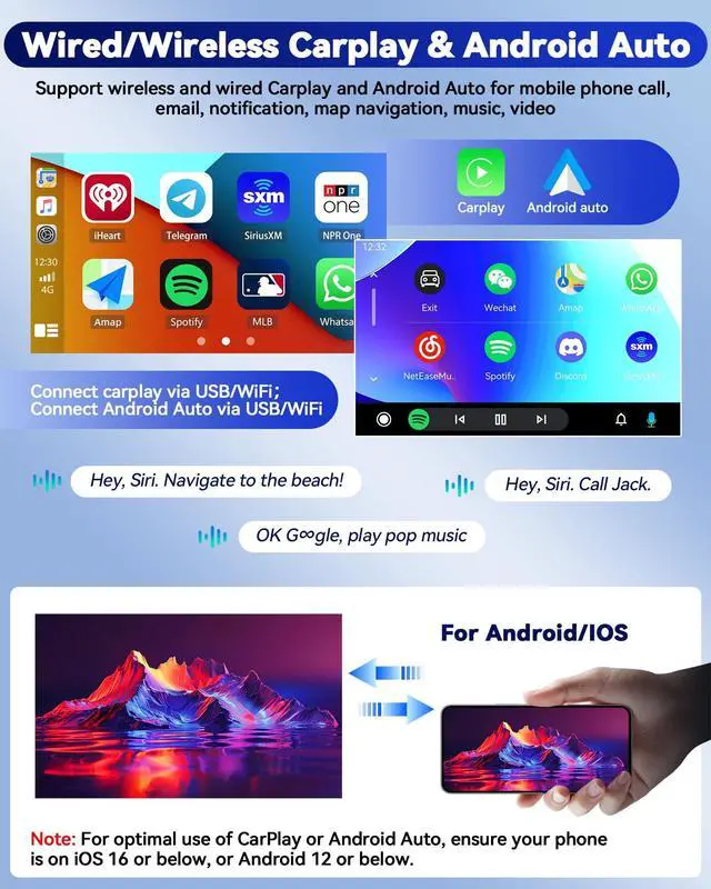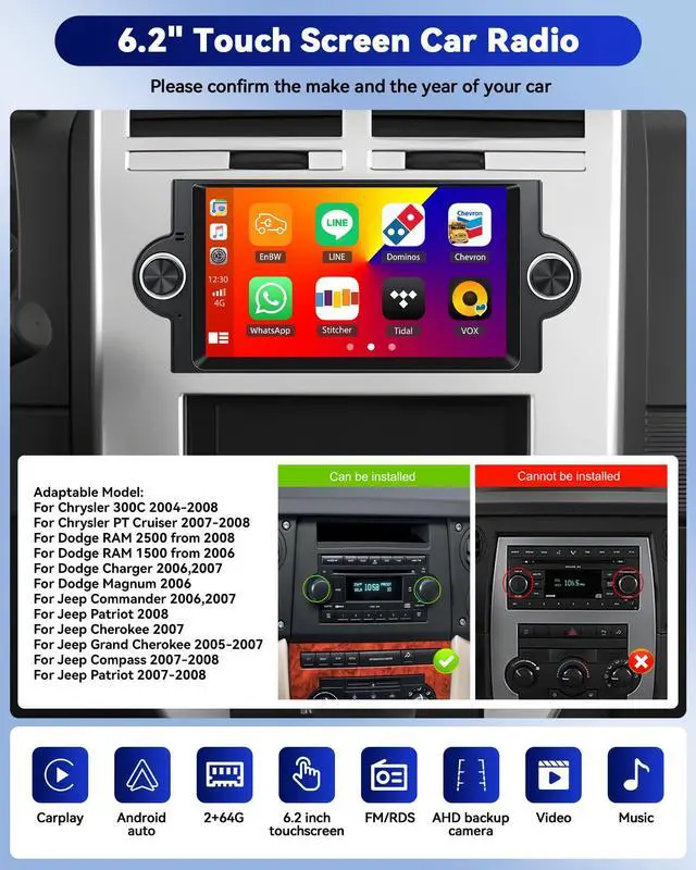 Car Radio For Jeep: For Chrysler 300C 2004/2005/2006/2007/2008, For Chrysler PT Cruiser 2007-2008, For Dodge RAM 2500 from 2008, For Dodge RAM 1500 from 2006, For Dodge Charger 2006-2007, For Dodge Magnum 2006, For Jeep Commander 2006-2007, For Jeep Patriot 2008, For Jeep Cherokee 2007, For Jeep Grand Cherokee 2005-2006-2007, For Jeep Compass 2007-2008, For Jeep Patriot 2007-2008 ^^ Wireless Carplay & Wired Android Auto & Mirror LinkCar stereo for Dodge Ram 1500/2500/3500 can choose wireless carplay or wired Android Auto, connect to mobile phone, access mobile phone address book, mail, notification, map navigation, music, video and other information, and realize voice control. Support IOS/Android mirror link function, You can mirror the phone interface to car stereo ^^ WiFi & GPS NavigationCar radio for Dodge Durango support WiFi function, built-in GPS Navigation, Connect to WIFI, and you will find a new world, online Maps can be used perfectly, you can go anywhere you want and never get lost again. Also can purchase directly from play store for offline navigation ^^ Blueotooth and FM/RDS for Chrysler 300 Touring/300C/300M android car radio support Bluetooth hands-free call, Bluetooth music playback, automatic loading of the phone book.
