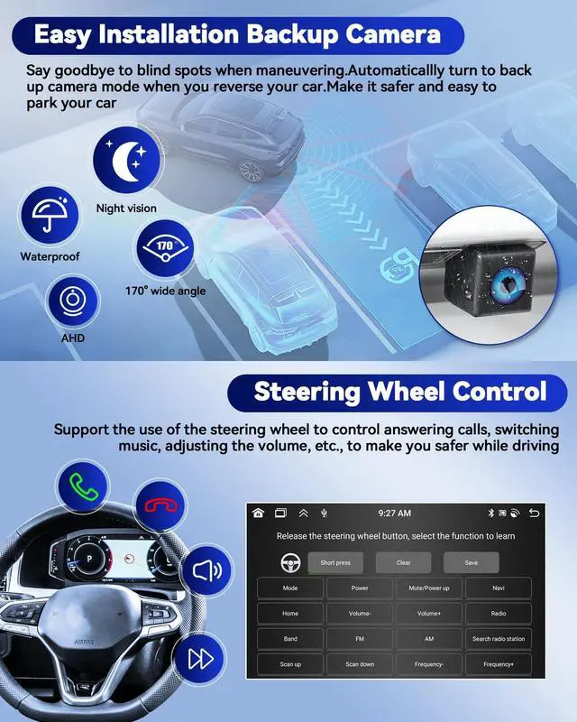 Support FM to transfer music to the car stereo system, Clear channel search and low noise, and preset 18 stations, And support to add an external microphone solving your calling problem (External microphone Included). Listen to channel transmissions, weather forecasts, road conditions in real time, etc. via FM/RDS radio ^^ Rear Camera and SWCCarPlay radio for Jeep Grand Cherokee 2005 support AHD camera image input, When entering reverse, the screen automatically switches to the reverse image. Car stereo support Steering wheel control fnction, You can control the Bluetooth car radio via the steering wheel buttons of the vehicle, which makes your ride more convenient