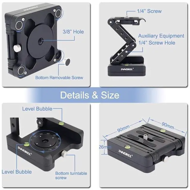 Size: 3.54 * 3.54 * 1.02 /9*9* 2.6 cmPacking list: Z Flex Tilt Head *1Exquisite Packaging Box*1Allen Wrench *31/4 to 3/8 Screw *5