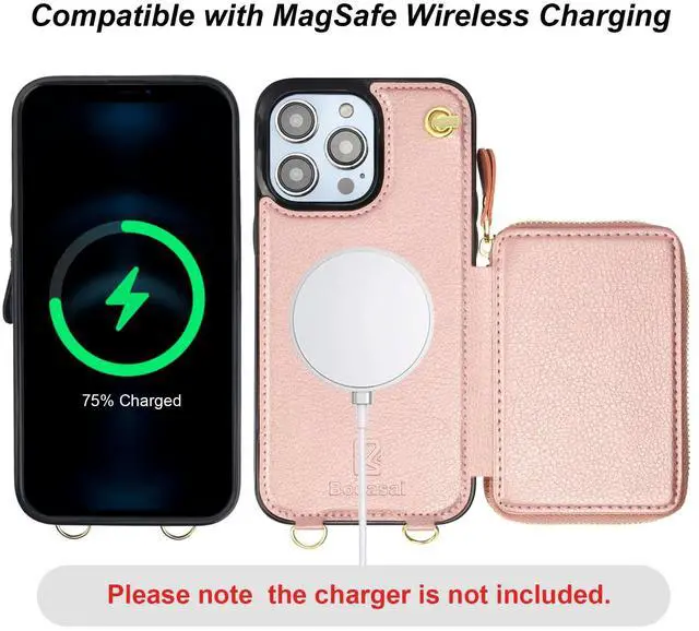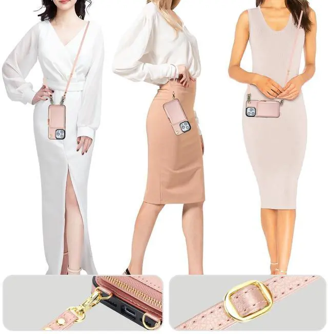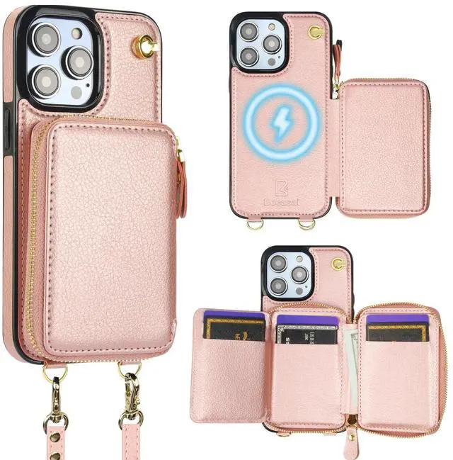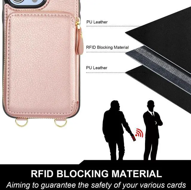 And the zipper closure can effectively keep your belongings inside. ^^ Convenient StrapsThere are 2 straps in this case with wallet for Mag Safe. An adjustable and detachable shoulder strap can make it to hang your phone on your neck horizontally or vertically as you like while a removable anti-lost wristlet allows you to hang your phone on your wrist. ^^ RFID Blocking MaterialThe RFID shielding material on our cross body protective case cover can effectively prevent the data in the chips of your cards from being read and copied through radio signals by RFID technology.
