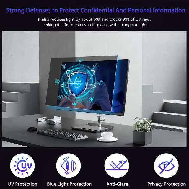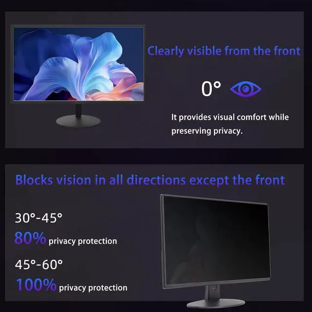Please note: The 24" screen protector can block the view on the left and right sides, but not the front view, no matter how far away ^^ Two Installation MethodsDesigned for easy, bubble-free application. It's also easy to remove and reuse. We offer two installation methods for your convenience. The first method uses 3M double-sided tape to apply the protector directly to the LCD screen, applying it along the edges. The second method uses a sliding mechanism, attaching the included plastic clips to the device frame, and then sliding the filter into place ^^ Excellent Anti-glare and Functional SelectionOur 24" Privacy film blocks 95% of reflected light to protect your eyes. Create a clear and transparent visual space and reduce the damage of glare to your eyes. It is a reversible privacy film. The matte surface can effectively block blue light and glare, while the glossy surface can more effectively protect privacy. You can choose flexibly according to your needs. In addition, it can protect your screen from dust and scratches ^^ Protection and DurabilityThis privacy screen protector is crafted from durable PET material, offering excellent scratch and impact resistance.