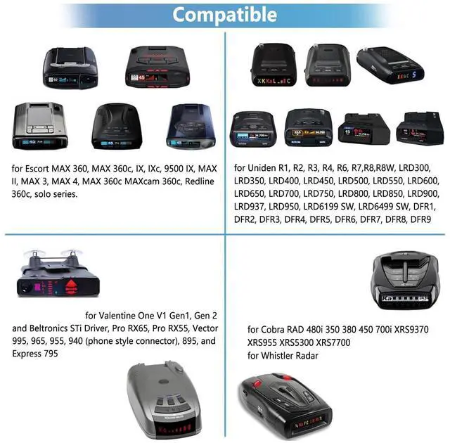 The perfect radar detector mirror tap power plug for a clean, hassle-free installation. ^^ Multi functional power options - equipped with RJ11 and DC 3.5 ports to match the connection of radar detectors. Before inserting, please check the manual to ensure proper connection. ^^ Powerful CompatibilityThe rearview mirror bracket and power adapter are compatible with all radar detectors with RJ1 interface and DC 3.5 circular hole interface, including Uniden R1 R3 R4 R5 R7 R8 Escort Passport 9500i, 8500 X50, Solo S2, Passport 7500S, 8500, 7500, 6800; Beltronics STi Driver, Pro RX65, Pro RX55, Vector 995, 965, 955, 940 (phone style connector), 895, and Express 795 etc radar detectors.