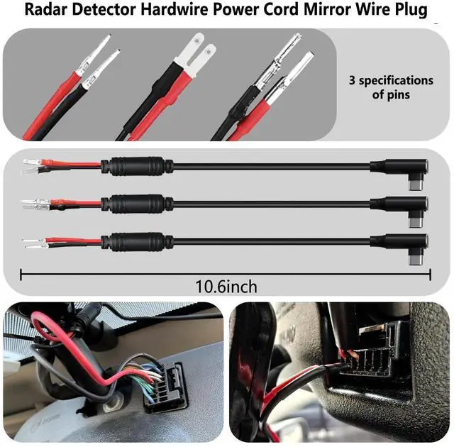 The adjustable swivel ball allows flexible positioning for optimal driving visibility. Features dual 1/4 screw holes on the handle for easy accessory expansion. Perfect for seamless radar detector mount integration. ^^ Universal Radar Detector Power Cord Features a 12V cigarette lighter adapter with a 12V- 1.5A (max) output, ensuring stable and reliable power for your radar detector. Easily connects to your vehicles lighter socket for seamless operation. A must-have radar detector power cord. ^^ Universal Radar Detector Mirror Tap Power Cord Includes 3 pin sizes for flexible compatibility with most vehicles. Features a hand-soldered 2A fuse for added protection, ensuring safe and stable power delivery.