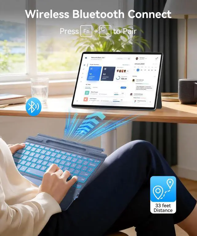 Bluetooth 5.3 keyboard]: This Surface Pro keyboard support 10 meter, press and hold the Fn+C key for 3 seconds to enter the pairing state. The Keyboard button is from ultra-thin material, lightweight and powerful.