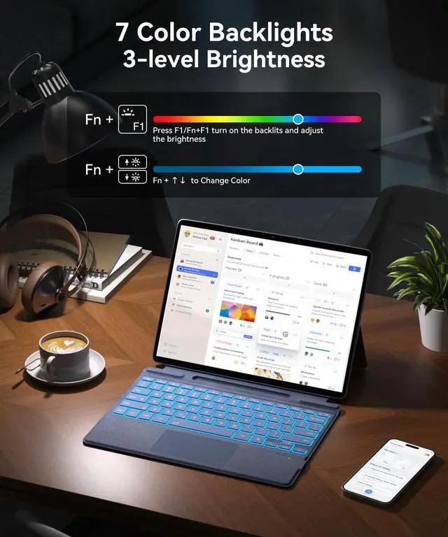 Color Backlit & Pencil Holder]: This surface keyboard with touchpad features 7 pleasant colors backlit with 3 brightness level. You may choose the colorful backlight you like to satisfy your needs of using the keyboard under different lighting conditions. (The pen holder only supports placement and does not support charging. ) ^^ [Ultra-Slim
