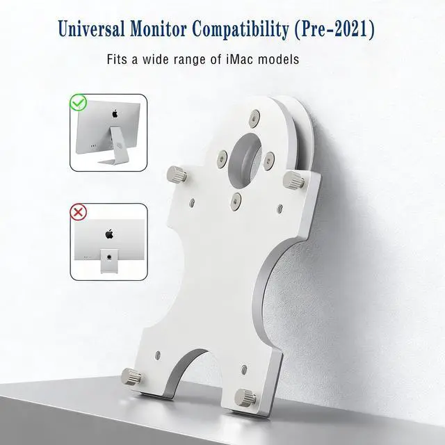 Reclaim Your Desk Space: VESA Mount Your Pre-2021 iMac, No Drilling Required! Tired of your iMac's fixed stand taking up valuable desk real estate? Our innovative adapter kit is the simple, safe, and perfect solution you've been looking for. It securely converts your beloved pre-2021 iMac (which lacks a native VESA mount) into a VESA-compatible display in minutes. Enjoy the ultimate flexibility of monitor arms and experience a cleaner, more ergonomic workspace.