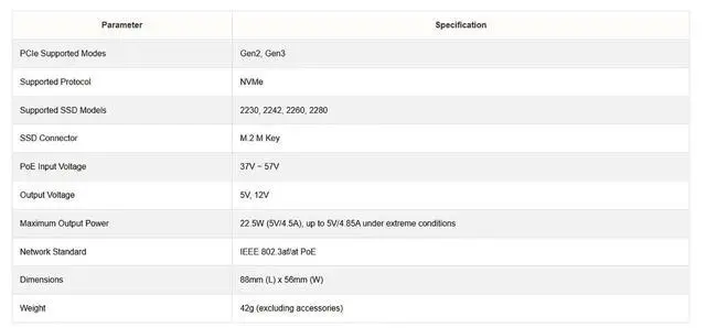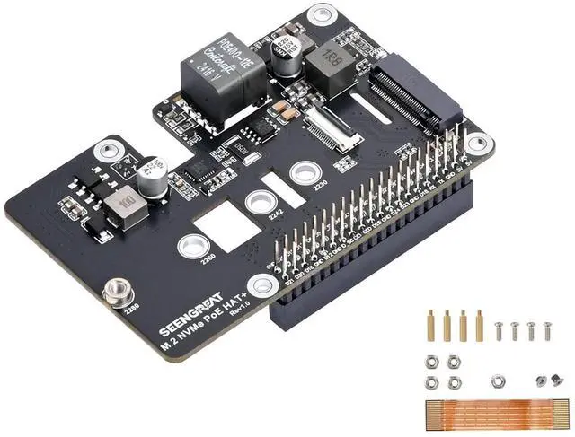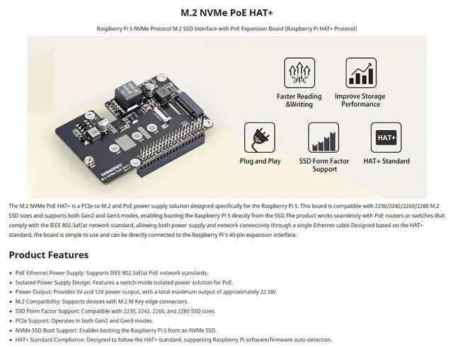High-Speed NVMe SSD Boot for Raspberry Pi 5 Supports PCIe Gen3 (8Gbps) and Gen2 modes, enabling fast NVMe SSD booting for enhanced performance. ^^ Power Over Ethernet (PoE) Compatible Works with IEEE 802.3 af/at PoE switches, delivering both power and network via a single Ethernet cable. ^^ Universal M. 2 SSD Support Fits 2230/2242/2260/2280 M. 2 NVMe SSDs with M Key connector, offering flexible storage expansion. ^^ Stable Isolated Power Design Provides 5V/12V output (max 22.5W ) with switch-mode isolation for safe, efficient power delivery. ^^ HAT+ Standard & Easy Installation Follows Pi HAT+ protocol, plug-and-play via 40-pin GPIO, ensuring seamless integration.