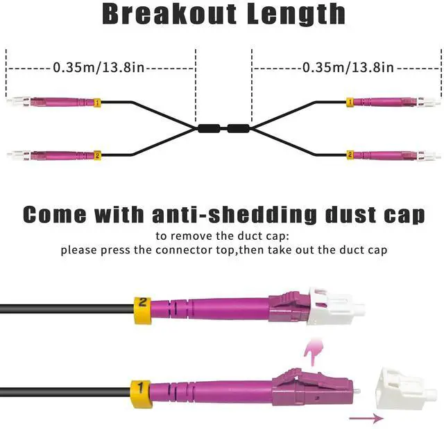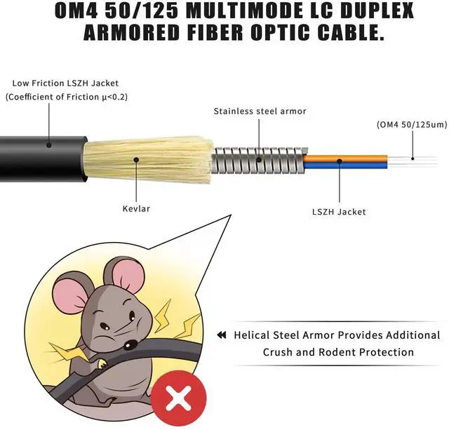 Fiber Cable: Surrounded by tough stainless steel tube, which can provides additional crush and rodent protection ^^ 2-Strand OM4 Multimode Fiber Optic Cord with Low Friction Flame Retardant LSZH Jacket (Coefficient of Friction < 0.2 ), which allows you quick and easy installation and higher cable density in conduit. ^^