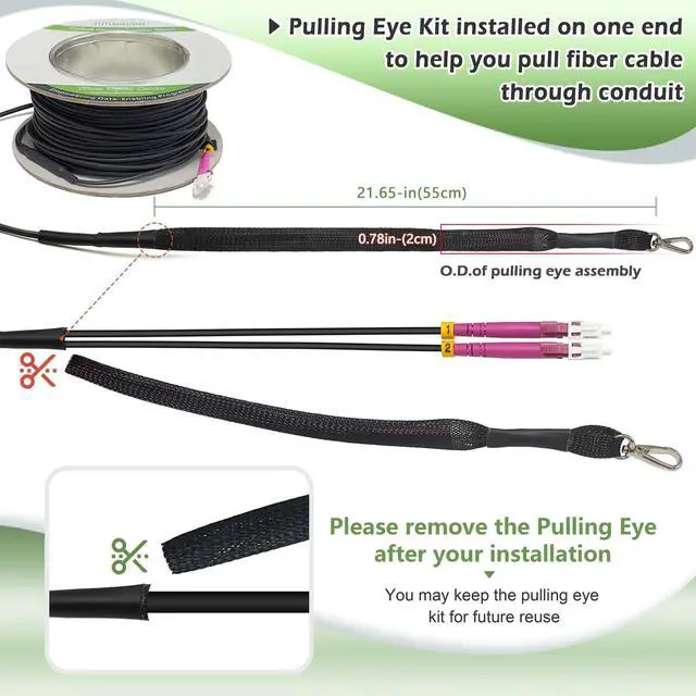 Pulling Eye Kit: with swivel pulling eye kit installed on one end to eliminate cable damage during installation. You can remove the pulling eye kit after installation and keep it for reuse. The pulling eye kit is a must for any riser or plenum fiber installation ^^ Armored OM4 LC