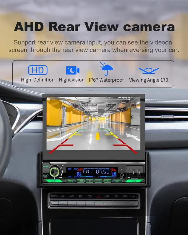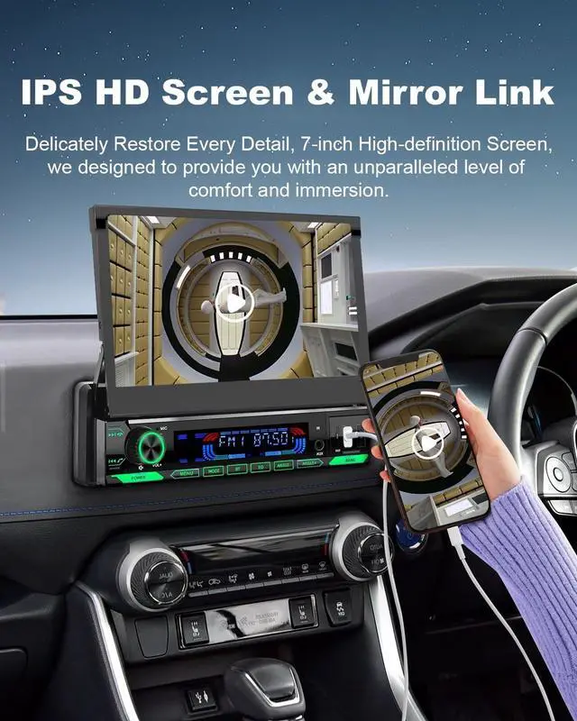 Wired Carplay & Android Auto SupportSingle din car stereo with 7-inch motorized LCD flip-out touchscreen with built-in Carplay and Android Auto, through which voice-assisted control is available on your car radio, giving you easier access to your phone's features, including music, GPS navigation, calls, notifications, messages and more ^^ Bluetooth 5.1 and FM/AM Radio Receiversingle din bluetooth car radio Quickly pair with your smartphone, built-in microphone (can also be connected to an external microphone), clear sound quality and stable performance for hands-free calls. Also supports FM/AM radio, you can listen to real-time traffic, news broadcasts, weather forecasts and more ^^ HD touchscreen and MirrorLinkSingle din touchscreen car radio resolution has been upgraded to 1024x600 Full HD for a crisp visual experience.