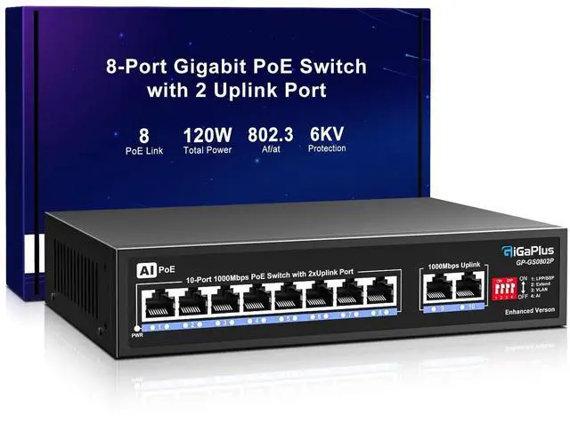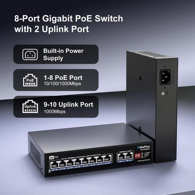 Gigabit PoE+ Switch: This 10-port Gigabit PoE+ switch features 8 PoE+ RJ45 ports and 2 Gigabit uplink ports for connecting NVR, Internet, and more. With high-speed data transmission and power transmission through network cables, it provides a reliable solution for your devices. ^^