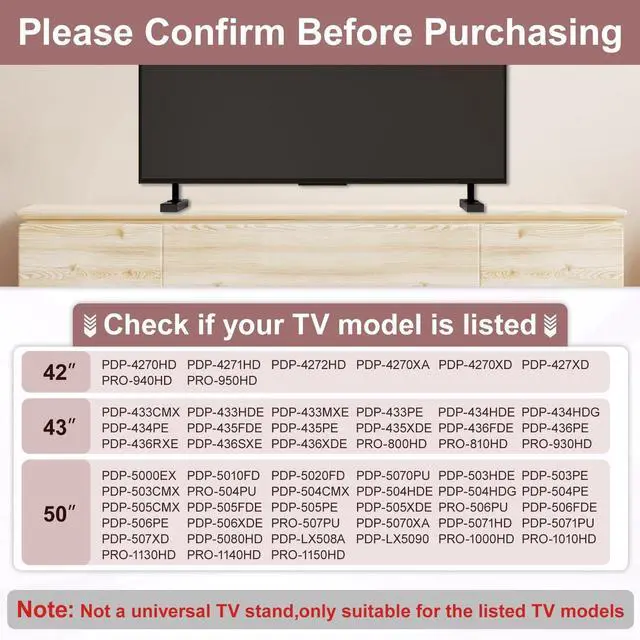 42": PDP-4270HD PDP-4271HD PDP-4272HD PDP-4270XA PDP-4270XD PDP-427XD PRO-940HD PRO-950HD43": PDP-433CMX PDP-433HDE PDP-433MXE PDP-433PE PDP-434HDE PDP-434HDG PDP-434PE PDP-435FDE PDP-435PE PDP-435XDE PDP-436FDE PDP-436PE PDP-436RXE PDP-436SXE PDP-436XDE PRO-800HD PRO-810HD PRO-930HD50: PDP-5000EX PDP-5010FD PDP-5020FD PDP-5070PU PDP-503HDE PDP-503PE PDP-503CMX PRO-504PU PDP-504CMX PDP-504HDE PDP-504HDG PDP-504PE PDP-505CMX PDP-505FDE PDP-505PE PDP-505XDE PRO-506PU PDP-506FDE PDP-506PE PDP-506XDE PRO-507PU PDP-5070XA PDP-5071HD PDP-5071PU PDP-5080HD PDP-507XD PDP-LX508A PDP-LX5090 PRO-1000HD PRO-1010HD PRO-1130HD PRO-1140HD PRO-1150HDTips: The TV stand is only applicable to the listed models for Pioneer TV. Before purchasing, please check your