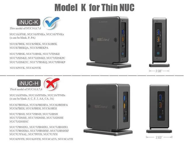 Notes: 1. Model K is for thin / slim NUC, while Model H is for thick / tall editions2. Compatible with Intel NUC6, NUC7, NUC8, NUC10 and NUC11 alone! 3. Not support 5th gen and before models4. Not support Intel Hades Canyon NUC8i7HVK, NUC8i7HNK and Skull Canyon NUC6i7KYK5. Mini PC and peripherals are NOT included in the package!