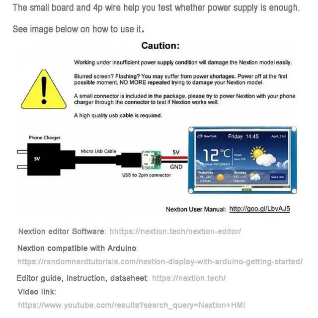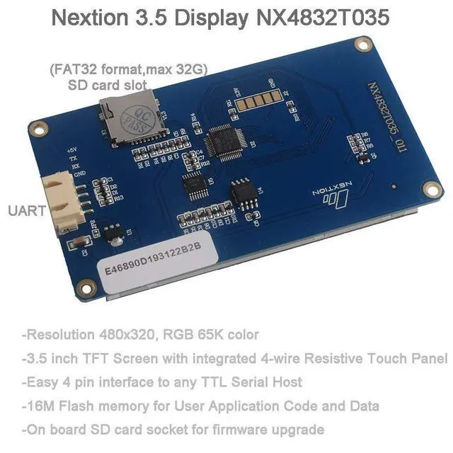 HMI: a 3.5" TFT 480 x 320 resistive touch screen display, 4M Flash, 2KByte RAM, 65k colors. ^^ -Nextion 3.5 display is a 5V device, but many development boards are 3.3V. It won't make the display power up. ^^ -To ensure Nextion basic 3.5 inch display work as expected, it's recommended to supply power via power adapter, not usb to ttl or boards. ^^ -Uploading TFT file via sd card is faster than the usb to ttl, but