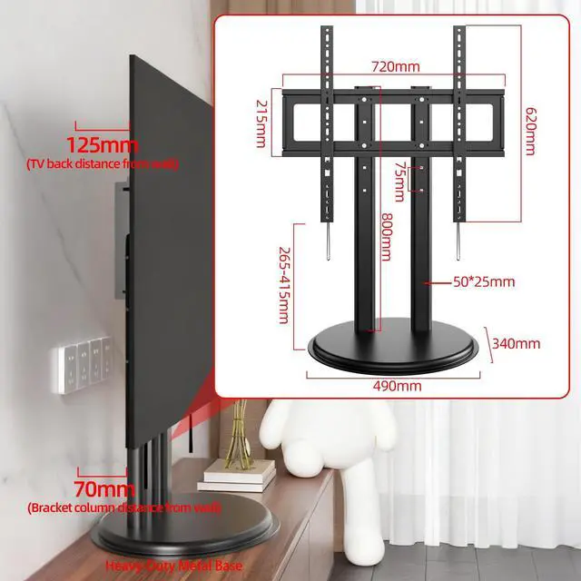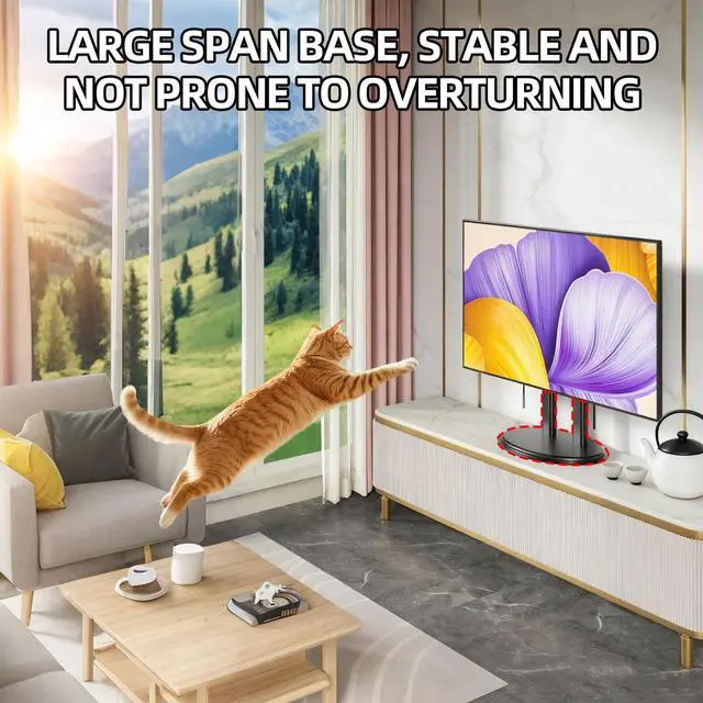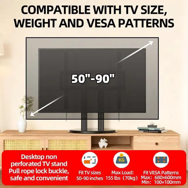 Universal TV Stand for 50-90 Inch TVsThis universal TV stand features a heavy-duty metal base and is compatible with most 50-90 inch flat-panel TVs (Max VESA 680x600mm). Offering superior stability, this robust table top TV stand safely holds up to 155lbs, making it a reliable and sturdy tv stand for living room. Please verify your TV's VESA pattern before purchase. ^^ Heavy-Duty Metal Base for Enhanced SafetyConstructed with a solid metal tv stand base, this universal tv stand base provides exceptional durability and support. The sturdy metal frame offers a secure foundation for large screens, including 85 inch and 86 inch tv stands, ensuring superior stability.