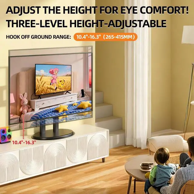^^ Height Adjustable for Optimal ViewingCustomize your entertainment setup with this height adjustable TV stand. Easily adjust the height to achieve the perfect viewing level for your 50-90 inch television. This versatile feature makes it an ideal tv stand for 85 inch tv and other large displays in any living space. ^^ Quick No-Drill InstallationSetting up your entertainment center is simple with this table top TV stand. The innovative no-drill installation requires no tools or complicated steps, allowing you to quickly assemble your universal tv stand. This user-friendly design is perfect for all living environments.