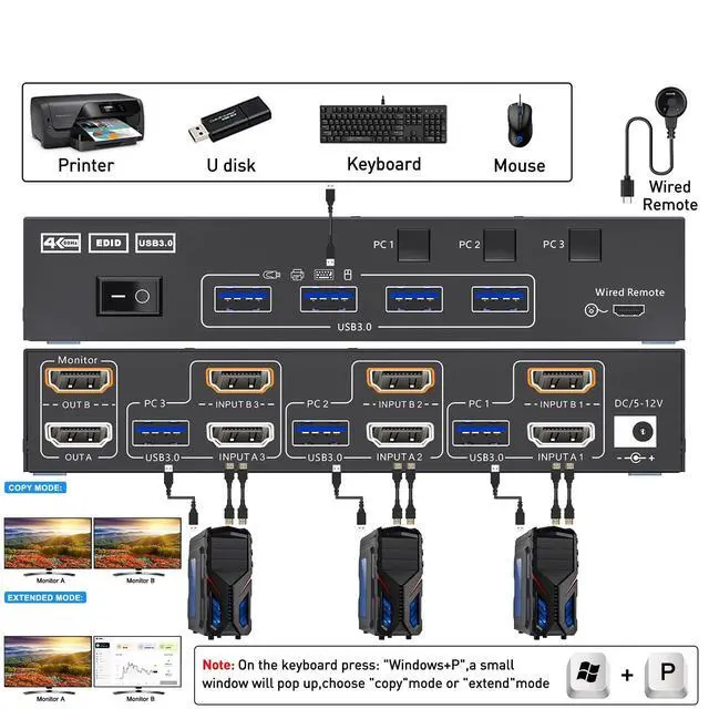 Note: If the input USB 3.0 ports are not connected to the KVM or connected incorrectly, the output USB device will not be recognized. ^^ EDID EmulatorUSB 3.0 HDMI KVM switch can simulate the EDID of the monitor, store the resolution and refresh rate of the display. How EDID works Lock screen, when you switch from PC1 to PC2, and then switch back to PC1 from PC2, the windows of PC1 will keep the order before switching and will not be disrupted. Automatically identifies and applies the best resolution to the monitor. ^^ 2 Switching Mode&IndicatorThis KVM Switch with 2 swtich methdos that are pressing the button on the panel and the wired controllerincluded). The three color indicator light will show which computer is the active computer. ^^ Extended Mode&Copy ModeDual display KVM switches require 2*HDMI connections per computer, and for computers with discrete and integrated graphics cards require both HDMI ports to be belong of the discrete graphics card.