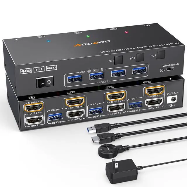 Dual Monitor KVM Switch for 3 PCThis Dual Monitor KVM HDMI Switch allows to control 3 computers by 1 set of keyboard & mouse and 2 monitors (Extend display mode or Copy display mode) ^^ Ultra HD 4K@60H USB 3.0 Dual Monitor KVM switch HDMI support resolution @. 3 computers 2 monitors switch aslo support input terminal to connect 2 computers with different resolutions, e. g. one is 4K@60Hz, the other is 4K@30Hz, 1440P@60Hz, 3D, 1080P@60Hz or lower resolution.