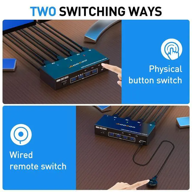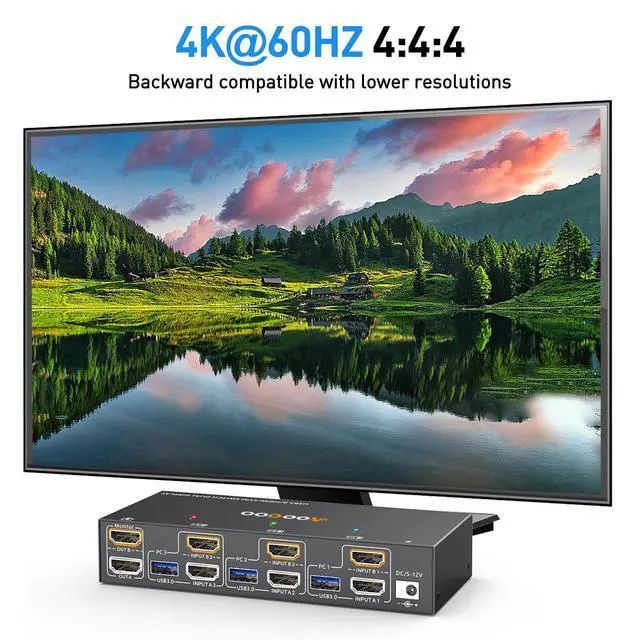 Note: if you need a 4K resolution, please use HDMI 2.0 cable and the length of the HDMI cables more short more better, and make sure your computers and monitors support 4K! ^^ Dual Monitor KVM Switch with 4 USB 3.0 PortsUSB 3.0 KVM switch with 4 USB 3.0 ports which can recognize keyboard, mouse, printer, scaner and other USB devices. USB 3.0 offers data transfer speeds of up to 5Gbps, while USB 2.0 offers data transfer speeds of only 480Mbps.